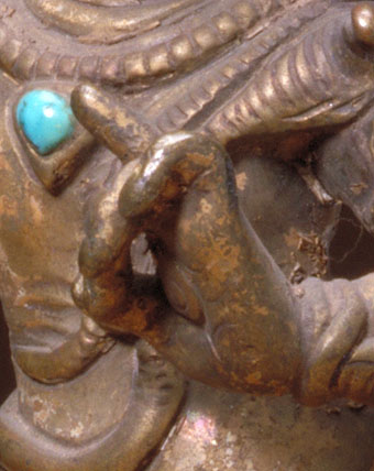 以两手分别作金刚拳(以四指握拇指于掌中,称为金刚拳),再以右拳握左手食指于胸前,据说此印相表示消灭无明烦恼,能得佛智慧。
