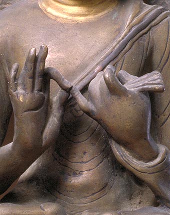以拇指与中指(或食指、无名指)相捻,其余各指自然舒散。这一手印象征佛说法之意,表现佛陀于鹿野苑初转法 轮时的状态,所以称为说法印,也称转法 轮印。