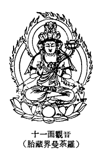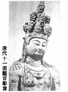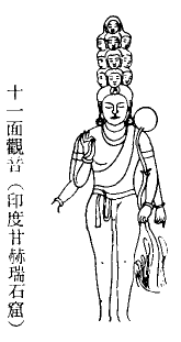 梵名 Eka^das/a-mukha。六观音之一,七观音之一。又作十一面观自在菩萨、大光普照观世音菩萨。渊源于印度婆罗门教之十一荒神(梵 Eka^das/a-rudra),或于西元五、六世纪顷掺入佛教。其十一面之配置有种种不同,又有二臂、四臂、八臂等异。十一面观自在菩萨心密言念诵仪轨经卷下记载其四臂之像,身长一尺三寸,前三面作寂静相,右三面作威怒相,左三面作利牙出现相,后一面为笑怒相,顶上之一面作如来相。又印度孟买甘赫瑞(Kanheri)石窟安置之四臂像,本面顶上有三重,各安三面,其上再加一面,凡十一面,四臂中左第一手持莲花,右第一手结施无畏印,其他二手所持之物不明。 我国山西天龙山第九窟、炖煌千佛洞伯希和第一○二号皆有十一面观音像,前者二臂,后者八臂。有关示现十一面之意义,依十一面神咒心经义疏载,顶上之佛面表示佛果,前三面慈相,见善众生而生慈心,大慈与乐;左三面嗔面,见恶众生而生悲心,大悲救苦;右三面白牙上出相,见净业者,发希有赞,劝进佛道;最后一面暴大笑面,见善恶杂秽众生而生怪笑,改恶向道。 在密教胎藏界曼荼罗中,十一面观音位列苏悉地院之最左端。具四臂,本面两侧各一面(忿怒形),其上具五面,其上复有三面。左第一手持莲花,第二手持军持(瓶),右第一手捻小指、食指,第二手捻小指、无名指。祈求十一面观音,可望除病、灭罪。又以十一面观音为中尊建立之曼荼罗,称为十一面观音曼荼罗。此外,日本十一面观音像之较着名者,有藏于圣林寺、观音寺之天平佛(木心干漆)等。(十一面观世音神咒经、十一面神咒心经、陀罗尼集经卷四)p324 上一篇 下一篇