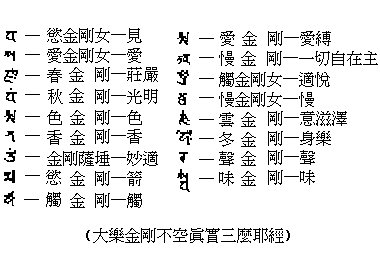 出自般若理趣经初段说金刚萨埵内证法门之文句。一切诸法虽现种种差别相,然其自性皆为绝待清净,证悟此自性清净之理,乃离差别之妄执,自他共受永劫真实之大乐,是金刚萨埵之内证,即所谓大乐之法门。十七句为:妙适清净句、欲箭清净句、触清净句、爱缚清净句、一切自在主清净句、见清净句、适悦清净句、爱清净句、慢清净句、庄严清净句、意滋泽清净句、光明清净句、身乐清净句、色清净句、声清净句、香清净句、味清净句。理趣经以男女异性之欲乐,表显金刚萨埵内证之大乐法门,显示出烦恼即菩提之极义。理趣释以此十七句配金刚萨埵之十七字真言及曼荼罗十七尊,为其内证法。如左图所示: 上一篇 下一篇
