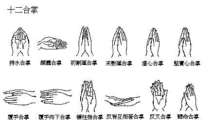 十二种合掌之形式,与六种拳印同为诸印契之基础,称为印母。乃合两掌所作之十二种印相。下列地、水、火、风、空依次为小指、无名指、中指、食指、拇指之异称。十二合掌即:(一)坚实心合掌,即坚合二掌,两掌间无空虚。(二)虚心合掌,又称空心合掌,即如坚实心合掌,惟两掌间存少许空虚。(三)未敷莲(华)合掌,又称未开莲合掌、如来开莲合掌,其形虚心合掌,而内空稍呈穹隆,似莲华未开形。(四)初割莲(华)合掌,即二地、二空相着,水、火、风三指稍离,如莲花初开状。(五)显露合掌,即两手并排,二地相着,掌心向上。(六)持水合掌,即两掌并仰,指头稍屈相着,仅二空各拄于二风侧,如掬水状。(七)归命合掌,又称金刚合掌,即十指头相互交叉,右手之五指置于左手五指之上。(八)反叉合掌,即两手背相合,十指相叉。(九)反脊(背)互相着合掌,即仰右手,俯左手,两手背相着。(十)横柱指合掌,即二手仰掌,仅二火相着仰之,余之指头稍开散。(十一)覆手向下合掌,即覆两掌,并二空,仅两火相着。(十二)覆手合掌,即覆两掌,二空并接,十指头皆向外。以上十二种合掌,各皆具有深秘之意义。 上一篇 下一篇