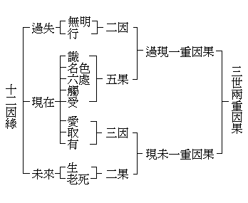 梵语 dva^das/a^n%gaprati^tya-samutpa^da。十二种因缘生起之意。又作二六之缘、十二支缘起、十二因缘起、十二缘起、十二缘生、十二缘门、十二因生。即构成有情生存之十二条件(即十二有支)。 (一)阿含经所说根本佛教之基本教义,即:无明(梵 avidya^)、行(梵 sam!ska^ra)、识(梵 vijn~a^na)、名色(梵 na^ma-ru^pa)、六处(梵 s!ad!-a^yatana)、触(梵 spars/a)、受(梵 vedana^)、爱(梵 tr!s!N!a^)、取(梵 upa^da^na)、有(梵 bhava)、生(梵 ja^ti)、老死(梵 jara^-maraN!a)。据长阿含卷十大缘方便经载,缘痴有行,缘行有识,缘识有名色,缘名色有六入,缘六入有触,缘触有受,缘受有爱,缘爱有取,缘取有有,缘有有生,缘生有老、死、忧、悲、苦恼大患所集,是为此大苦阴缘。即此十二支中,各前者为后者生起之因,前者若灭,后者亦灭,故经中以(大一·六七上)“此有故彼有,此生故彼生;(中略)此无故彼无,此灭故彼灭”之语,说明其相依相待之关系。即一切事物皆具有相依性,皆由因、缘所成立,故说无常、苦、无我。 在阿含经典中,除十二缘起说之外,另有十支、九支、八支、七支等缘起说,广义而言,彼等皆含摄于十二缘起说中。又杂阿含经卷十二谓,缘起法乃永恒不变之真理,佛观察此真理而开悟,并为众生开示此法。又若自有情生存之价值与意义方面观察十二缘起之意义,则指人类生存之苦恼如何成立(流转门),又如何灭除苦恼而至证悟(还灭门)。即有情之生存(有)乃由识(精神之主体)之活动开始,识之活动成为生活经验(行),复由活动之蓄积形成识之内容。然识之活动乃识透过感觉器官(眼、耳、鼻、舌、身、意六处)接触认识之对象(即一切心、物(名色)),此系主观上感受之事。凡夫之识以无明(对佛教真理无自觉)为内相,以渴爱(求无厌之我欲)为外相,渴爱即识之根本相,且发展而取一切为我,成为我执(取),故由此染污识之活动所薰习之识,必应经验生、老、死等所代表之人间苦、无常苦。反之,圣者因灭无明及渴爱,故人间苦亦灭。 (二)对十二缘起,俱舍论卷九举出如下四种解释:(1)刹那缘起,即一刹那间心中具足十二支,例如因贪心而起杀生之瞬间,在彼时刹那间心中充满愚痴、无明,故有行杀之意愿产生。(2)连缚缘起,即此十二支连续不断,形成前因后果之关系。(3)分位缘起,例如三世两重因果之解释,即十二支分乃表示有情生死流转之过程及其状态。(4)远续缘起,指十二支之连续缘起可远隔多世。有部采用分位说(三世两重因果),即无明与行是于过去世起烦恼造业时有情之分位,指身心(五蕴)而言。依此过去世之二因,心识始托生母胎之刹那,其有情之分位为识;托生之第二刹那以后,六根未备之分位为名色;胎内六根具足之分位为六处;出胎后但有接触感觉以至二、三岁为止,其分位为触;四、五岁至十四、五岁间感受性极胜,分位为受;以上从识至受,称为现在世之五果。 其后,爱欲强烈之十六、十七岁以后为爱;贪着心胜之三十岁以后为取;如此造业之分位为有;以上三者,称为现在世之三因。由此因感生未来世之分位为生;此后至死为老死,以上二者属未来世之二果。类此,分为过现未三世,再立二重之因果,此谓三世两重因果,如上表所示。 因中含摄惑、业,果即是苦,故十二缘起摄于惑业苦之三道,而因果不断,无始无终。经部不赞同有部之说,主张无明绝非单指过去之无智,亦非指五蕴而言。 (三)据成唯识论卷八所载,无明至有为因,生、老死为果,故立一重因果。然因与果必须异世,从而立二世一重因果。无明与行两支系由识至受之五支的因,故二支为能引支,五支为所引支,此七支亦总称牵引因。以爱、取、有三支为因,能生未来之生与老死两支,故三支称能生支或生起因;生、老死称所生支或所引生。 (四)天台宗立思议生灭、思议不生不灭、不思议生灭、不思议不生不灭等四种十二因缘,以此配于化法四教(藏、通、别、圆)。圆教称十二因缘为佛性,即表示依缘而生之现象无非是中道之理。 观十二缘起,与四谛观同为佛教重要之观法,据传释尊因观此而开悟证果。据阿毗达磨杂集论卷四,依无明而行等顺次观迷之生起者,称为杂染顺观;于老死等支各立苦集灭道四谛,从老死逆次观迷之生起者,称为杂染逆观。由无明灭则行灭等顺次观悟之现成者,称为清净顺观;由老死灭而生灭等逆次观悟之现成者,称为清净逆观。 据大毗婆沙论卷二十四所说,观迷生起之流转门系除无明、行外之十支,观悟现成之还灭门则系观十二支。然依巴利文律之大品,流转门为顺观,还灭门称为逆观,至今仍采此说。且天台宗指出,依三世两重、二世一重、刹那一念三种十二因缘观,各依序可破断见(包含常见)、着我见、性实见等三种见解。(中阿含经卷十涅盘经、卷二十四大因经、增一阿含经卷三十“六重品”、卷四十六放牛品、法华玄义卷二、法界次第初门卷中)p337 上一篇 下一篇