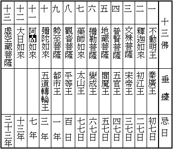 即:初七日为不动明王,二七日为释迦如来,三七日为文殊菩萨,四七日为普贤菩萨,五七日为地藏菩萨,六七日为弥勒菩萨,七七日为药师如来,百日为观世音菩萨,一周忌为势至菩萨,三回忌为阿弥陀如来,七回忌为阿閦如来,十三回忌为大日如来,三十三回忌为虚空藏菩萨。此外,日本民间信仰又依垂迹说,而配以十王与十三佛曼荼罗。然此并无经典之依据。p364