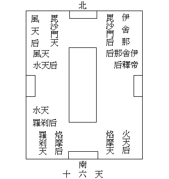 又作十六大天。八字文殊仪轨所称之十六大天外护。即以东、南、西、北、东南、西南、西北、东北等天部中之主者,一一各有二位,合为十六天。东方为帝释天及帝释后;南方为焰摩天、焰摩后;西方为水天、水天后;北方为毗沙门天、毗沙门后;东南为火天、火天后;西南为罗刹天、罗刹后;西北为风天、风天后;东北为伊舍那、伊舍那后等。其图如右。p384