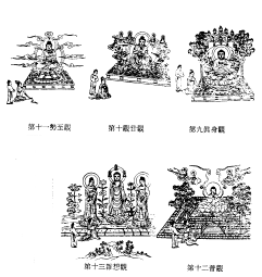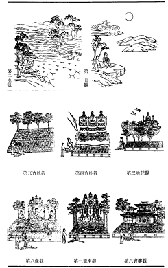 即十六种观法;出自观无量寿经。又作十六观法、十六想观、十六妙观、十六正观、十六观门。念佛行者由忆念弥陀之身与净土,得以往生西方,总其观行有十六种。即:(一)日想观,又作日观、日想。正坐西向,谛观于日,令心坚住,专想不移。见日欲没,状如悬鼓,既见日已,开目闭目皆令明了。(二)水想观,又作水观、水想。初见西方一切皆是大水,再起冰想,见冰映彻,作琉璃想。(三)地想观,又作地观、琉璃地观、地想。观想下有金刚七宝金幢擎琉璃地,地上以黄金绳杂厕间错,一一宝各有五百色光等。(四)宝树观,又作树观、树想。观极乐国土有七重行树,七宝花叶无不具足,一一花叶作异宝色,又一一树上有七重网。(五)宝池观,又作八功德水想、池观。观想极乐有八功德水,一一水中有六十亿七宝莲花,摩尼水流注其间演妙法。又有百宝色之鸟,常赞念佛、念法、念僧。(六)宝楼观,作此观想即刻成就以上五种观法,故又作总观。亦作总观想、总想观。观想其一一界上有五百亿宝楼,其中无量诸天作伎乐。又有乐器,悬处虚空,不鼓自鸣。(七)华座观,又作华座想。观佛及二菩萨所坐之华座。(八)像观,又作像想观、佛菩萨像观、像想。观想一阎浮檀金色佛像坐彼花上,又观音、势至二菩萨像侍于其左右,各放金光。(九)真身观,又作佛观、佛身观、遍观一切色身想。观想无量寿佛之真身;作此想即可见一切诸佛。(十)观音观,又作观世音观、观观世音菩萨真实色身想。观想弥陀胁士中之观世音菩萨。(十一)势至观,又作大势至观、观大势至色身想。观想另一胁士大势至菩萨。(十二)普观,又作自往生观、普往生观、普观想。观自生于极乐,于莲花中结跏趺坐。莲花开时,有五百色光来照身,乃至佛菩萨满虚空。(十三)杂想观,又作杂观、杂明佛菩萨观、杂观想。观丈六佛像在池水上,或现大身满虚空。即杂观真佛、化佛、大身、小身等。(十四)上辈观,又作上品生观、上辈生想。往生净土者依其因,而有上、中、下三辈,三辈复分上、中、下三品,总为九品。上辈观即观上辈徒众自发三心、修慈心不杀行等、临终蒙圣众迎接,及往生后得种种胜益之相。(十五)中辈观,又作中品生观、中辈生想。即观中辈徒众受持五戒八戒、修孝养父母之行等,及感得圣众迎接而往生等相。(十六)下辈观,又作下品生观、下辈生想。即观下辈徒众虽造作恶业,然临终遇善知识,而知称念弥陀名号,因之得以往生,及蒙种种胜益之相。 慧远之观无量寿经义疏卷本将此十六观大别为二类,初之七门为观依报,后九门观彼之正报。又后十观中,初之五门明佛菩萨观,次一门明自往生观,再次一门明佛菩萨观,后三门明他生观。智顗之观无量寿佛经疏卷下分之为三类,初之六观观依果,次七观观正报,后三观明三辈九品之往生。慧远诸师皆以此十六观为定善观法,善导则称唯初十三观为定善,后九品为散善;又定善之中,初七观为依报观,次六观为正报观。(观无量寿佛经疏卷一玄义分、十六观赞、观无量寿佛经妙宗钞卷一、佛祖统纪卷五十三)( 上一篇 下一篇