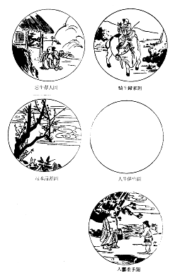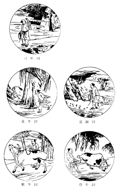 宋代廓庵师远撰绘(一说清居禅师作)。此十图以牧牛为主题,并各附自序及偈颂,以阐示修禅之方法与顺序。十牛图颂(全称住鼎州梁山廓庵和尚十牛图颂并序),一卷,收于卍续藏第一一三册。所谓“十牛”,即:(一)寻牛,喻吾人放失本具圆成之心牛,寻于得失是非之中。(二)见迹,喻依经解义,阅教知踪,渐见心牛之迹。(三)见牛,喻依闻法修学之功,发见本具之心牛。(四)得牛,喻虽得心牛,犹存烦恼习气,恐再放心,遂加修练。(五)牧牛,图示持牛之鼻索而牧之,得纯和之相。即示身不离修练之意,喻悟后之调心。(六)骑牛归家,喻脱离情识妄想之羁绊,骑本具之心牛,归还自己本来之家乡。(七)忘牛存人,喻若归本觉无为之家乡,无须再修练,则无事安闲。(八)人牛俱忘,喻凡情脱落而全界无物,凡圣共泯,生佛俱空,故图以空白表之。(九)返本还源,以水绿山青,不留一尘一埃之图,喻自己之本心本来清净,无烦恼、妄念,当体即诸法实相。(十)入廛垂手,绘济度众生而垂慈悲手,入市井之尘境相,以喻不偏居于向上,更能向下入利他之境。十牛图与信心铭、证道歌、坐禅仪合印,称四部录。 寻牛颂: 茫茫拨草去追寻,水阔山遥路更深; 力尽神疲无所觅,但闻枫树晚蝉吟。 见迹颂: 水边林下迹偏多,芳草离披见也么? 纵是深山更深处,辽天鼻孔怎藏他? 见牛颂: 黄鹦枝上一声声,日暖风和岸柳青; 只此更无回避处,森森头角画难成。 得牛颂: 竭尽精神获得渠,心强力壮卒难除; 有时才到高原上,又入烟云深处居。 牧牛颂: 鞭索时时不离身,恐伊纵步入埃尘; 相将牧得纯和也,鞭锁无拘自逐人。 骑牛归家颂: 骑牛迤逦欲还家,羌笛声声送晚霞; 一拍一歌无限意,知音何必鼓唇牙。 忘牛存人颂: 骑牛已得到家山,牛也空兮人也闲; 红日三竿犹作梦,鞭绳空顿草堂间。 人牛俱忘颂: 鞭索人牛尽属空,碧天辽阔信难通; 红炉焰上争容雪,到此方能合祖宗。 返本还源颂: 返本还源已费功,争如直下若盲聋; 庵中不见庵前物,水自茫茫花自红。 入廛垂手颂: 露胸跣足入廛来,抹土涂灰笑满腮; 不用神仙真秘诀,直教枯木放花开。p403 上一篇 下一篇