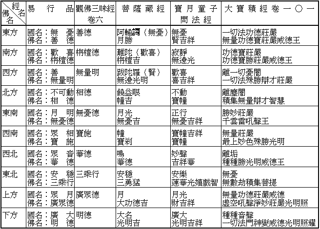 称念十方十佛之名,得不退之法门。指龙树之十住毗婆沙论卷五易行品所述说诸佛易行之一种。原出自宝月童子问法经。以称名较他种修行容易,故说易行。易行品载,行人若欲速至不退转地,应以恭敬心执持而称其名号。诸经所举十方十佛之名略异,列表如下:p434