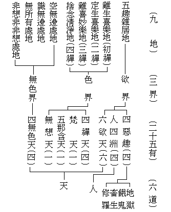 梵语 trayo dha^tavah!,巴利语 tisso dha^tuyo。<一>指众生所居之欲界、色界、无色界。此乃迷妄之有情在生灭变化中流转,依其境界所分之三阶级;系迷于生死轮回等生存界(即有)之分类,故称作三有生死,或单称三有。又三界迷苦之领域如大海之无边际,故又称苦界、苦海。(一)欲界(梵 ka^ma-dha^tu),即具有淫欲、情欲、色欲、食欲等有情所居之世界。上自第六他化自在天,中包括人界之四大洲,下至无间地狱等二十处;因男女参居,多诸染欲,故称欲界。(二)色界(梵 ru^pa-dha^tu),色为变碍之义或示现之义,乃远离欲界淫、食二欲而仍具有清净色质等有情所居之世界。此界在欲界之上,无有欲染,亦无女形,其众生皆由化生;其宫殿高大,系由色之化生,一切均殊妙精好。以其尚有色质,故称色界。此界依禅定之深浅粗妙而分四级,从初禅梵天,终至阿迦腻吒天,凡有十八天。(三)无色界(梵 a^ru^pya-dha^tu),唯有受、想、行、识四心而无物质之有情所住之世界。此界无一物质之物,亦无身体、宫殿、国土,唯以心识住于深妙之禅定,故称无色界。此界在色界之上,共有四天(空无边处天、识无边处天、无所有处天、非想非非想处天),又称四无色、四空处。 三界可细分为二十五有(界),若将色界之那含天析而为五(即五那含天),则共为“二十九有”。其与九地之关系,如下表所示: 此三界之果报虽有优劣、苦乐等差别,但属迷界,系众生生死轮回之趣,故为圣者所厌弃。法华经譬喻品(大九·一四下):“三界无安,犹如火宅;众苦充满,甚可怖畏。”又化城喻品(大九·二四下):“能于三界狱,勉出诸众生。”即劝三界诸有情莫以三界为安,当勤求解脱。(南本大般涅盘经卷十三、俱舍论卷八、品类足论卷五、大毗婆沙论卷七十五、瑜伽师地论卷四、大智度论卷二十一、华严经孔目章卷二)( <二>指断界、离界、灭界等三种无为解脱之对治道。(一)断界,即断除九结(九种烦恼)中除贪以外之其余八种烦恼,或断除无明结。(二)离界,谓断离贪烦恼或断除爱结。(三)灭界,谓断灭有漏善及诸有为、无覆无记等烦恼。即除九种烦恼外之其余有漏法。大毗婆沙论卷二十九(大二七·一四八中):“一切行断,故名断界;一切行离,故名离界;一切行灭,故名灭界。”(顺正理论卷七十二、俱舍论卷二十五) <三>指色界、无色界、尽界。(长阿含经卷八、品类足论卷五) <四>指法界、心界、众生界。此系基于华严经心、佛、众生三无差别之说而立。(大日经疏卷三) <五>萨满教基本观念之一。主张宇宙分为上、中、下三界。依各族而说法稍异。如蒙古族萨满教认为上层世界为神灵世界,中层世界为人类、动物之居地,下层世界为死神与魔鬼聚集之世界,即地狱。在中层世界与下层世界间,复有一不可知之世界,为人死后之去处。p584 上一篇 下一篇