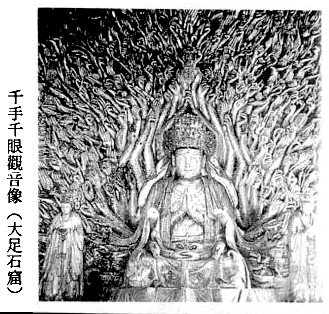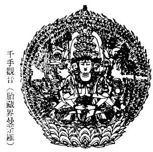六观音之一。全称千手千眼观自在(梵 Avalokites/vara-sahasrabhuja-locana)。又作千手千眼观音、千眼千臂观音、千手圣观自在(梵 Sahasra-bhuja^rya^valokites/vara)、千臂观音、千光观自在、千眼千首千足千舌千臂观自在。据千手千眼大悲心经载,观自在菩萨于往昔闻广大圆满无碍大悲心陀罗尼,为利益一切众生,乃发具足千手千眼之愿,而即刻得其身。 诸经所载形像不一,有身作檀金色,一面千臂者;有身作黄金色,半跏坐于赤莲花上,十一面四十手,前三面呈菩萨相,本面有三眼,右三面白牙向上,左三面为忿怒相,后一面暴笑,顶上一面现如来相者;有身作金色,千臂千眼五百面者。于密教现图胎藏界曼荼罗为二十七面千臂,跏坐于宝莲花上,千手中有四十(或四十二)臂持器杖。又依千光眼观自在菩萨秘密法经,千手系表以四十手各济度二十五有,故千臂非必具足,但有四十手即可,乃表观音菩萨广大慈悲之化用,故多以千臂称之;且各面各手所代表之功德成就法及印言,亦随各尊本誓之不同而异。 其千眼系于千手之掌中各有一眼。然若为四十手者,则仅有四十眼。据大悲心陀罗尼经载,四十手所持之物或所呈之手相各为:施无畏、日精摩尼、月精摩尼、宝弓、宝箭、军持(瓶)、杨柳枝、白拂、宝瓶、傍牌、钺斧、髑髅宝杖、数珠、宝剑、金刚杵、俱尸铁钩、锡杖、白莲花、青莲花、紫莲花、红莲花、宝镜、宝印、顶上化佛、合掌、宝箧、五色云、宝戟、宝螺、如意宝珠、罥索、宝钵、玉环、宝铎、跋折罗、化佛、化宫殿、宝经、不退转金轮、蒲桃,另有加上甘露手而合为四十一手者。各手之功德成就法及印言等,一一具载于经轨中。 于莲华部诸尊之中,此尊为最胜之尊,故又称莲华王。其种子为[fan(hri^h!)](hri^h!),系[fan(ha)][fan(ra)][fan(i^)][fan(ah!).gif](ha ra i^ ah!)四字所合成之字,表示贪(ra)嗔(i^)痴(ha)三毒转入涅盘(ah!)之义。据千手仪轨所载,此尊之根本印系以二手作金刚合掌,手背稍曲相离,二中指相合,二拇指、二小指分开竖直。此印又称莲华五古印、九山八海印、补陀落九峰印。其余经轨另载有二十四种印、二十五种印之说。结根本印时,则诵根本陀罗尼,而有如下四种成就:(一)息灾,(二)增益,(三)降伏,(四)敬爱钩召等。然以其陀罗尼较长,故一般皆诵念小咒,即:唵(om!,归命)缚日罗(vajra,金刚)达摩(dharma,法)纥哩(hri^h!,种子)。据千手千眼大悲心陀罗尼经等载,诵持此尊之陀罗尼者,可免受饥饿死、恶兽残害死、树崖坠落死等十五种之恶死,而得眷属和顺、财食丰足、道心纯熟等十五种之善生;或治诸种疾病、虫毒、难产死产、夫妇和合、延命、灭罪等。 有关此尊之仪轨及图像等,至唐朝时始传至我国。据千眼千臂观世音菩萨陀罗尼神咒经之序所载,武德年中(618~626),中天竺僧瞿多提婆赍来此尊之形像及结坛手印之经本;贞观年中(627~649),另有北天竺僧以千臂千眼陀罗尼之梵本奉进,后由智通译成汉文。故有关此尊之信仰,至七世纪已逐渐形成。 近代学者考察此尊之信仰于印度形成之情形,发现于印度神话中,相当于此尊之神格有因陀罗(梵 Indra)、原人(梵 Purus!a)、湿婆(梵 S/iva)、毗纽(梵 Vis!N!u)等,此等诸神均有千眼之说。又大教王经卷九亦记载大自在天有千手千面之说。近代学者于西域等地探险,曾发现不少千手观音画像之断片及曼荼罗等。(千光眼观自在菩萨秘密法经、千手观音姥陀罗尼身经、补陀落海会轨、密教发达志卷二、Le Coq: Die buddhistische Spa|tantike in Mittelasien; A. Stein: The Thousand Buddhas)p734 上一篇 下一篇