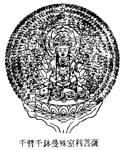 全称五顶五智尊千臂千手千钵千佛释迦曼殊室利菩萨。略称千钵文殊。乃五字文殊之一。由身上出千臂,每臂各持一钵,故有此名。敦煌千佛洞有二种此菩萨之壁画,依伯希和所编,存于第六窟者,即描绘趺坐须弥山大宝莲华上之文殊,发有五髻,宝冠中安置一佛,以百宝璎珞环钏天衣严饰,左右第一手屈于胸前,左手持钵,钵中安置释迦,右手第一、二指相捻支钵,左右第二手于脐前契法界定印,掌中持钵,中亦有释迦,其余千手分六层围绕全身,呈一大圆光,计有二百臂二百钵。存于第七十二窟者,类似前者,戴五佛宝冠,约有三百五十臂,层层围绕,成一大月轮形,极为壮观。两图均为五代宋初所制,为千佛洞壁画中之翘楚。(大乘瑜伽金刚性海曼殊室利千臂千钵大教王经卷一、卷五、Pelliot:Les Grottes de Touen-Houang,I,Ⅱ)p743 上一篇 下一篇
