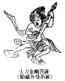 大力,梵名 Maha^-bala,音译摩诃嚩攞。位于密教现图胎藏界曼荼罗金刚手院第一列金刚萨埵菩萨左方之侍者。密号大勤金刚,种子为[fan(he)](he),三昧耶形为独股。其形像,开口怒目,火发逆立,右手屈臂,手掌上仰,置于胸前,微屈四指,拇指舒展,左手举臂竖肘,执独股杵,两足各踏莲花。身着天衣,衣之两端飞飏左右。胎藏图像所载则是两手各执独股杵,交叉于胸前,半跏趺坐。(广大仪轨卷四、胎藏界曼荼罗私钞、胎藏界曼荼罗尊位现图抄私卷二)p750
