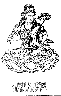 大吉祥大明,梵名 Maha^s/ri^-maha^vidya,音译摩诃室利摩诃微地也。大吉祥表示不染生死、清净无垢莲花三昧,大明有照应度机类无边际之义。为密教现图胎藏界曼荼罗观音院中列上方第五位之菩萨。又作大吉祥观自在菩萨、大吉祥。身呈肉色,趺坐于赤莲花之上。左手持开敷之莲花,置于腰侧。右手置于胸前,竖掌向外,捻拇指、食指,屈中、无名指,立小指。左侧有使者持花鬘。密号灵瑞金刚,种子为[fan(sa)](sa),三昧耶形为开敷之莲花。(秘藏记、诸说不同记卷三、胎藏界七集卷上)p774 上一篇 下一篇