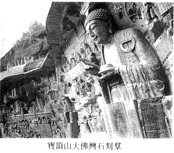 位于四川大足县宝顶山。大足县县城四周冈峦起伏,山岭重叠。自唐至清,境内十余处石崖雕刻数以万计之佛像,其中以北山与宝佛顶两处规模最大。宝顶山大佛湾石刻大都根据佛经中之故事而来。在三百多窟龛中,有臂膀圆润、体态饱满之观音;有挺腰嗔目,肌肉强劲之力士;有衣带飘舞,演奏天乐之飞天;有侍立佛侧,虔诚肃穆之男女信众。此类形像反映出唐代雕刻之写实手法与当时社会民俗之情况。观诸雕刻之佛、菩萨、飞天等石像,举凡面型、姿态、衣冠、服饰等均趋向中国化,已颇具民族风格。其侧有小佛湾,又称大宝楼阁,原规模较大,后圯毁,现存造像六百余尊,石壁四垣遍布雕像,中有小室,称为毗卢庵,内外壁均镌有本尊行化图及地狱变像图等,雄伟壮观。前有一石塔,方型三层,除雕像外,满刻十二部大藏经目录,但所用部类等与一般藏经目录不同。( 上一篇 下一篇