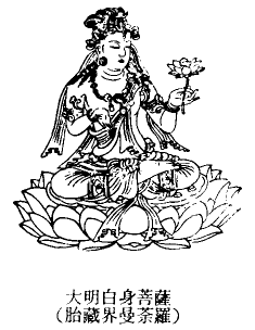 大明白身,梵名 Gauri^ maha^vidya,音译毫利摩诃微地也。为密教安于现图胎藏曼荼罗观音院内第五位之菩萨。密号常净金刚、放光金刚,种子为[fan(sa)](sa,谛不可得之义),三昧耶形为开敷莲花。身呈浅黄色,右手屈臂,手掌上仰,置于胸前;左手屈肘,手掌向上,执开敷之莲花,坐于赤莲花上。大悲空智金刚大教王仪轨经卷四金刚王出现品以此尊为八明妃之一,名遨哩明妃(藏 Gos-dkar-mo,意译白衣女),盖以此尊与白衣观音同体。(玄法寺仪轨卷一、胎藏界七集卷上、阿娑缚抄卷二○七胎曼释上、大日经疏演奥钞卷十六本)p798 上一篇 下一篇