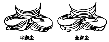 坐法之一。凡三种:(一)出自不空罥索经卷九、慧琳音义卷八、希麟音义卷二等,即先以左足压右股,后以右足压左股,两足交叉而坐,两手置于交趺之足上,右手居上之全跏坐。(二)依据不思议疏卷下所载,为右脚着于左腿上之半跏坐。(三)依据准提陀罗尼经所载,为交胫竖膝之箕坐,系与息灾法相应之坐法。行者须面向北方,以右足踏左足上,坐相犹如箕形。(大日经卷七持诵法则品、金刚顶瑜伽护摩仪轨、供养次第法疏卷下)p2239