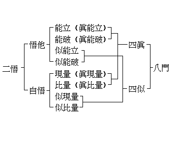 因明用语。印度新因明论商师羯罗主以八项义门来总摄因明之正理。即:能立、能破、似能立、似能破、现量、比量、似现量、似比量。又称因明八义。前四者为悟他门,后四者为自悟门。(一)能立(梵 sa^dhana),指理论圆满,证明确切,于实质与形式双方皆无过失之立论。为与“似能立”分别之故,又称为真能立。此种圆满无过之立论,可令敌者(问难者)与证义者了悟立论者之主张确为正理,故属悟他门。(二)能破(梵 du^s!aN!a),指用以破斥他人之言论确有破斥之力量,能将对方之立论摧毁。为与“似能破”分别之故,又称为真能破。使用能破之法时,破斥者为自,原立论者与证义者为他。能破使原立论者与证义者了悟原立论之非,故亦属于悟他门。(三)似能立(梵 sa^dhana^bha^sa),“能立”之对称。或简称似立。指有过失之言论;或因理论欠圆满,或因证明之确切,而易被敌者破斥之立论。(四)似能破(梵 du^s!aN!a^bha^sa),“能破”之对称。或简称似破。指似是而非,不得其正,不能获致攻破实效之驳论。(五)现量(梵 pratyaks!a), 指知觉及知觉所得之知识。例如经由眼见(知觉)而知某物为红色(知识)。现量使自己认识身体内外之情况,所以属于自悟门。(六)比量(梵 anuma^na),由已知之事物而推知未知之事物。现量与比量同为认识之知识,现量所得为直接知识,比量所得为间接知识。又若就比量与能立而别之,比量根据某一事理以推知另一事理,能立择取某种理由以证明其所欲建立之主张,二者所循之理论与所用之论式完全相同,其理论亦皆圆满无缺,然所以比量属于自悟门而能立属于悟他门,仅因获益对象之不同而已;若撇开获益者不论,而专就两者之规则、论式与效果而言,则比量亦是能立。(七)似现量(梵 pratyaks!a^bha^sa),又称似现。指似是而非之现量,亦即一般所说之错觉与幻觉。由错觉与幻觉所得之知识,即非正确之知识。(八)似比量(梵 anuma^na^bha^sa),似是而非,有过失之比量。比量即是能立,似比量即是似能立。以上似能立、似能破、似现量、似比量合称似;能立、能破、现量、比量称为四真。 因明讲求启发正智,领悟真理。四似虽不能启发正智,然其本来目的,似能立、似能破原想有所立或有所破斥而用以开悟他人,似现量、似比量亦想使自己认识真理。从功用上看,四似不同于四真;从目的上言,四似与四真无别,故因明仍将四似列入悟他、自悟二门。(因明入正理论疏卷上本、因明入正理论义纂要、因明入正理论疏前记卷上本、因明论疏瑞源记卷一、因明入正理论悟他门浅释(陈大齐))( 上一篇 下一篇