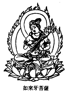 如来牙,梵名 Tatha^gata-dam!s!t!ra^,音译怛他哦多能瑟吒罗。为密教胎藏现图曼荼罗释迦院外列,位于佛南方第一位之菩萨。此尊乃主佛德,摧破生(众生)佛(诸佛)差别之执着。密号护法金刚、调伏金刚。形像为全身呈肉色,右掌当胸,稍屈中指、无名指等,左拳置胸前,持开敷之莲花,莲上有牙,脸朝右,坐于赤莲上。种子为[fan(dam!)](dam!)。三昧耶形为莲花上牙。据大日经卷四密印品载,此尊印契为“虚心合掌”,屈二食指入掌内向上。真言为:归命怛他哦多(tatha^gata,如来)能瑟吒罗(dam!s!t!ra,牙)罗娑罗娑釳罗(rasa^gara,味胜上)三钵罗博迦(sampra^paka,得)萨缚(sarva,一切)怛他哦多(如来)微洒也(vis!aya,境界)三婆缚(sambhava,生)莎诃(sva^ha^);意即“普遍归命诸佛,得咀嚼无上法味之如来牙,系由一切如来之境界而生”p2349 上一篇 下一篇