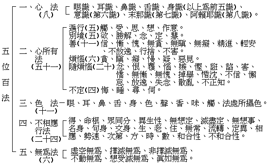 指百种法。唯识家将一切有为、无为之诸法,总括为百种,即:(一)八种心法,眼、耳、鼻、舌、身、意、末那、阿赖耶等八识。(二)五十一种心所有法,作意、触、受、想、思、欲、胜解、念、定、慧、信、惭、愧、无贪、无嗔、无痴、勤(精进)、轻安、不放逸、行舍、不害、贪、嗔、痴、慢、疑、恶见、忿、恨、覆、恼、嫉、悭、诳、谄、害、憍、无惭、无愧、掉举、惛沈、不信、懈怠、放逸、失念、散乱、不正知、悔、眠(睡)、寻、伺。(三)十一种色法,眼、耳、鼻、舌、身、色、声、香、味、触、法处所摄色。(四)二十四种心不相应行法,得、命根、众同分、异生性、无想定、灭尽定、无想报(无想事)、名身、句身、文身、生、老、住、无常、流转、定异、相应、势速、次第、方、时、数、和合性、不和合性。(五)六种无为法,虚空、择灭、非择灭、不动灭(不动)、想受灭、真如等无为法。以上五大类称为五位;与百法应并举,即称五位百法。兹将百法之内容表解如上页。 百法之说,出自大乘百法明门论、成唯识论等书,其中若干说法与其他诸家有异,如:(一)有关心所有法,瑜伽师地论卷一,于前记之五十一种心所有法外,另列邪欲、邪胜解等二种,成为五十三种心所有法;大乘阿毗达磨杂集论卷一,将心所有法中之恶见别为萨迦耶见、边执见、见取见、戒禁取见、邪见等五种,成为五十五种心所有法。(二)有关色法,显扬圣教论卷一,于色法另列地、水、火、风四种,成为十五种色法。(三)有关不相应行法,大乘五蕴论于不相应行法唯举十四种,即于上记之二十四种法中,列举“得”至“流转”等十四项;大乘阿毗达磨杂集论卷二,则删除不和合性而成为二十三种不相应行法。(四)有关无为法,瑜伽师地论卷三,另列善不善法无为、无记法无为等,成为八种无为法。又于小乘说一切有部,依法相生起之次第,分诸法为色法、心法、心所有法、心不相应行、无为等,大乘唯识家则依唯识转变之次第而分。(成唯识论卷七、大乘百法明门论解、大乘百法明门论疏)p2493 上一篇 下一篇