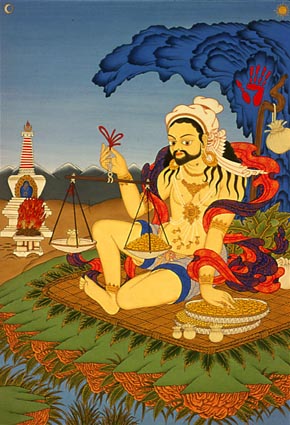 他住在般卡拉地方,以卖食物点心为生。 他经常供养一位瑜伽士食用所需,有一天瑜伽士问他:“你为什么要承事供养我?”他回答:“为了未来修持解脱道来集聚资粮。”“那么你能够为了将来的解脱来作禅修吗?”瑜伽士问他。“我可以。”他回答。 瑜伽士就给予他加持灌顶,并且赐给他能够见到自心本性的教授如下: “自心如意珍宝中, 轮涅殊异万象生。 悟与不悟之差别, 不变本性中观照。 轮涅妄念何能生, 妄念本来无自性。 诸法本来即无生, 不悟则陷迷乱贪爱中。” 他因此了悟一切显现即是自心,也体验到自心本性无所来去。他就将心安住于无所变异中,经过了六个月,断除了迷乱妄念,证悟了自心本性。 之后他就如野兽般的在尸陀林中到处流浪,行径如疯人般的往来于乡村都市间,他的眼睛睁大瞪视他人,样子极为恐柿。人们都认为他的样子狰狞恐怖,所以称他为梅果巴,就以此闻名于世。 他以甚深的佛法调伏了许多弟子,最后他自述了证悟的种种过程,即身前往卡雀空行净土。 这是咕噜梅果巴大师的故事。 ![]() 上一篇 下一篇