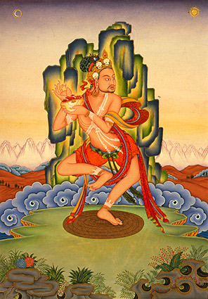 他住在拉札布力地区,是属于平民阶级。以作工来为生。他有五个小孩,由于往昔的业力,他的妻子去逝了。他将尸体运到尸陀林中,在那里伤心哭泣着。陆续不久他的五个子女全部都死掉了,他再次将尸体陆续搬到尸陀林中,他在尸陀林中痛苦哭泣着。 这时瑜伽士纳波杰巴大师经过这里,问他在这里作什么?他告诉瑜伽士:“瑜伽士呀,我的太太和小孩全部过世了,我受到沉痛的打击,心中没有办法忘记他们,因此呆在这里难过。”纳波杰巴大师告诉他:“三界轮回中的众生都是处在这样的痛苦中,不是只有你一个人受到这种打击,你不要再因此而伤痛。你再悲伤对自己也无益,应该要努力修持佛法。难道你仍然对轮回中的生生死死不感到恐惧吗?” 他回答:“我现在对轮回生死很是恐惧,如果您有能得到解脱的法门,请您教我。”大师就在喜金刚的坛城中给予他灌顶,并开示了生起圆满次第的口诀,叫他依法如下去修持:“以小孩的骨头作成六骨饰来穿戴,将妻子的头骨切下来当钵,头骨就是生起次第,头盖骨中的虚空就是圆满次第。” 他依照上师的教授精进来修持,经过了九年,能够作生起圆满二次第的双运禅修,得到了证悟。他告诉弟子: “吾乃头骨瑜伽士, 吾见诸法之本质, 证悟与头骨无别, 住于任运自在中。” 他说完后,飞身至虚空中舞蹈,众人都对他生出了信心,称他为嗄巴拉大师。 大师自述了证悟的过程,在五百年中利益了许多众生。最后带领了六百位弟子前往卡雀空行净土。 这是咕噜嗄巴拉大师的故事。 ![]() 上一篇 下一篇