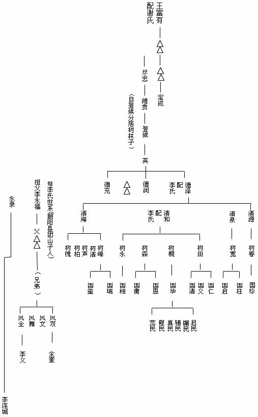 王树桐字凤仪,众称为王善人。祖籍河北省、密云县、石匣镇宣华社八甲,始祖王公富有,于顺治八年徙居热河省朝阳县南王家营子。