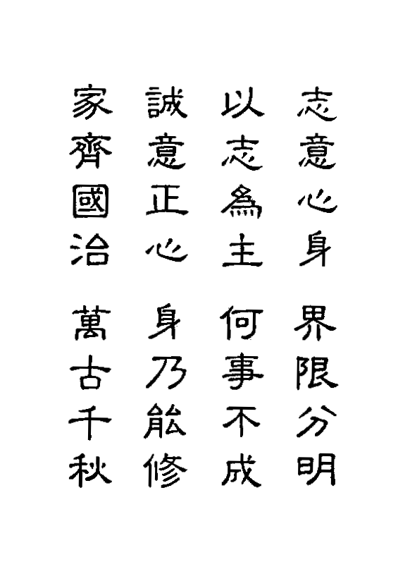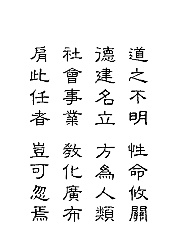 我在少年时,常听亲友向我说,我的曾祖、祖父、父亲,都读过书。而我曾祖,尤有善书之名。我一天学也未上过,可以说目不识丁,将来何面目见祖宗于地下呢?想到这里,非常惭愧,因而立志,我无论如何贫苦,非令我儿子入学读书不可。后来我的儿子,八岁入塾读书,很聪明的,先生非常夸奖。我见这种情形,便想道:先人、后人,都能读书,我可怎好呢?我便自誓说:我也非读书不可。由三十八岁起,我便习学善书,后来渐能识字,且能讲善书,现在又能和大家研究道德,真是可乐,这都是从立志上来的。先天后天的分析