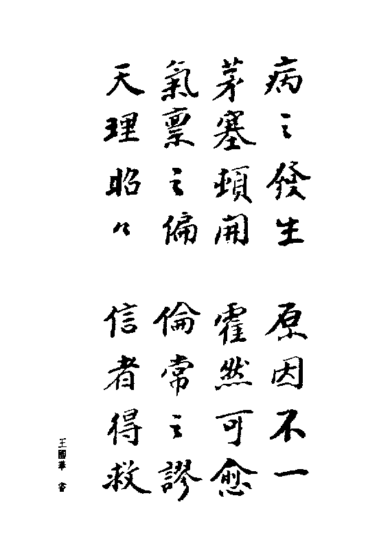 某妇人,患痨病,请我去劝。我到她家,看见她支使儿女,她的儿女,不听话,我便知道,她男人是三纲不振。我把儿女不听话的原因,说一说,正中她的病源,病者就一一的说起夫君的过,我听了许多时,便告辞。出在外边,告知她男人说:你回去就对病人说,“王先生说的,真是太也对了,千万不可说他不对”,她必定还向下说,说完,病就好了。过了几天,我又到她家说:你把别人的过错,都说完了,你自己还有过呢?她便述起自己的过来,说完,病真就好了。找自己的道