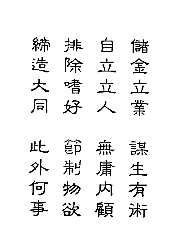 世人之迷信八门的,每一出门或做事,都要看看八门。信八字的,又常请瞎先生批八字。我说孝、悌、忠、信、礼、义、廉、耻,是极好的八门。人若从这门里走,八字没有不好的。成圣、成贤、成佛、成神,都用不了。但是也要看看自己从哪个门进去。我是由“忠”字门进来的,从小为人牧牛,长大为人做活,而后在家力田,入宣讲堂劝人,办女义学,倡导道德,我敢说,我一时也没有不忠诚去做。有了一个“忠”字,其他的七德,也就不缺了。我的八门和八字,还有不好的吗?世人又何必迷信呢?怨人是苦海管人是地狱